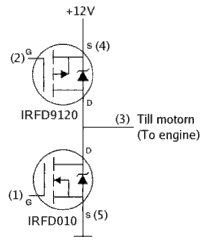 Jag provade också att mäta spänningarna till de FET-transistorer som satt på hårddiskens kretskort. Jag har tänkt löda loss dom transistorerna, och använda dom i den egenbyggda drivkretsen. För varje anslutning till motorn finns det ett komplementärt transistorpar (en N-FET och en P-FET). Eftersom motorn hade tre anslutningar, så behöver man tre identiska drivkretsar. I schemat för en av dom är några mätpunkter utmarkerade: