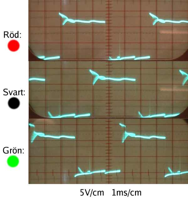För att ta reda på hur den skulle drivas, så mätte jag upp spänningarna till anslutningarna medan hårddisken var igång. Hade varit lätt med ett trekanals oscilloskop, men har i stället mätt två anslutningar i taget och lagt ihop bilderna med GIMP för att se kurvformerna. Färgerna på kablarna till motorn var rött, svart och grönt.