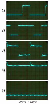 Bilden nedan visar uppmätta signaler i dom utmarkerade punkterna ovan för ett av de tre komplementära par som driver en av motorns anslutningar. Notera hur mycket störningar som man fått på 0V samt +12V-linjen. Det kan eventuellt ställa till med problem för logikkretsar om man inte avstör sina kopplingar riktigt ordentligt.