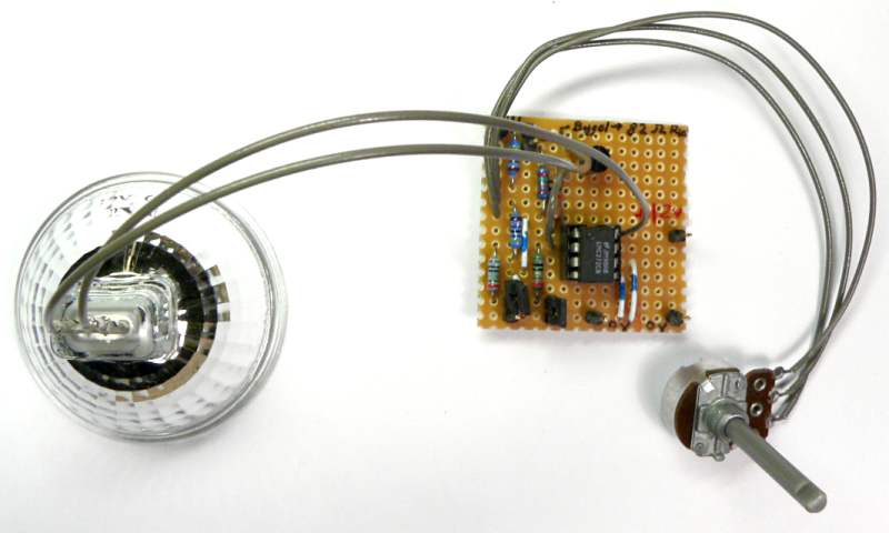För ett tag sen byggde jag en grej som krävde att jag kunde styra ljuset från en LED-hallogen väldigt exakt. Den LED-spotlight jag använde kom från Clas-Ohlson, och var avsedd för 12V. Det fina med Clas-Ohlsons LED-hallogen-lampor är att dom innehåller en likriktare, utan någon efterföljande kondensator (i alla fall dom jag köpte i början av 2005). Därmed kan dom kopplas in polaritetsoberoende, och kan moduleras med väldigt höga frekvenser.