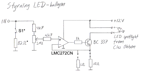 Jag behövde modulera ljuset med upp till 13 kHz. Min insignal skulle variera från 0-5V, motsvarandes inget ljus -> max ljus. Min konstruktion ser ut så här: