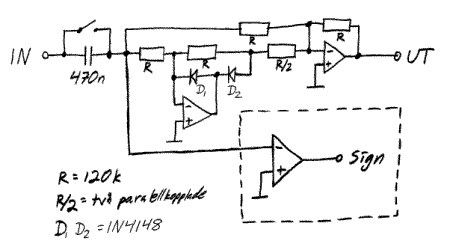 En precisions-likriktare tar absolutbeloppet av en insignal. Det betyder att utsignalen är lika stor som insignalen, fast positiv även om insignalen är negativ. Från början trodde inte jag att detta skulle bli en egen konstruktion. Hade hittat ett schema i boken "Elektronisk Mätteknik". Det är för övrigt en väldigt bra bok, men just deras schema för precisionslikriktning var felaktigt. Det upptäckte jag först när jag byggt kretsen, och skulle provköra den. Provade sen att simulera kretsen, och den fungerade inte då heller. Fick konstruera om likriktaren. Mitt schema ser ut så här: