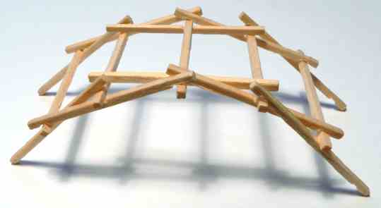 Såg en intressant artikel om detta i Ny Teknik får länge sen, som jag sparat. Orkade inte scanna in den, utan byggde en modell i stället. Om man använt pinnar med större längd-tjockleks-kvot, så hade bron blivit längre i stället för att vara kort och hög. Det bästa med denna typ av broar är att dom är självlåsande, och håller ihop bättre ju högre vikt man lägger på bron.
