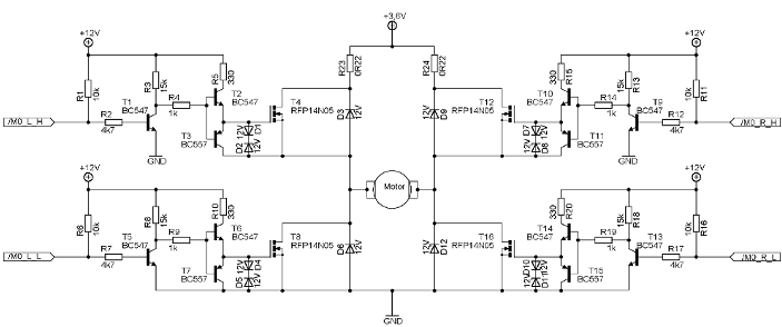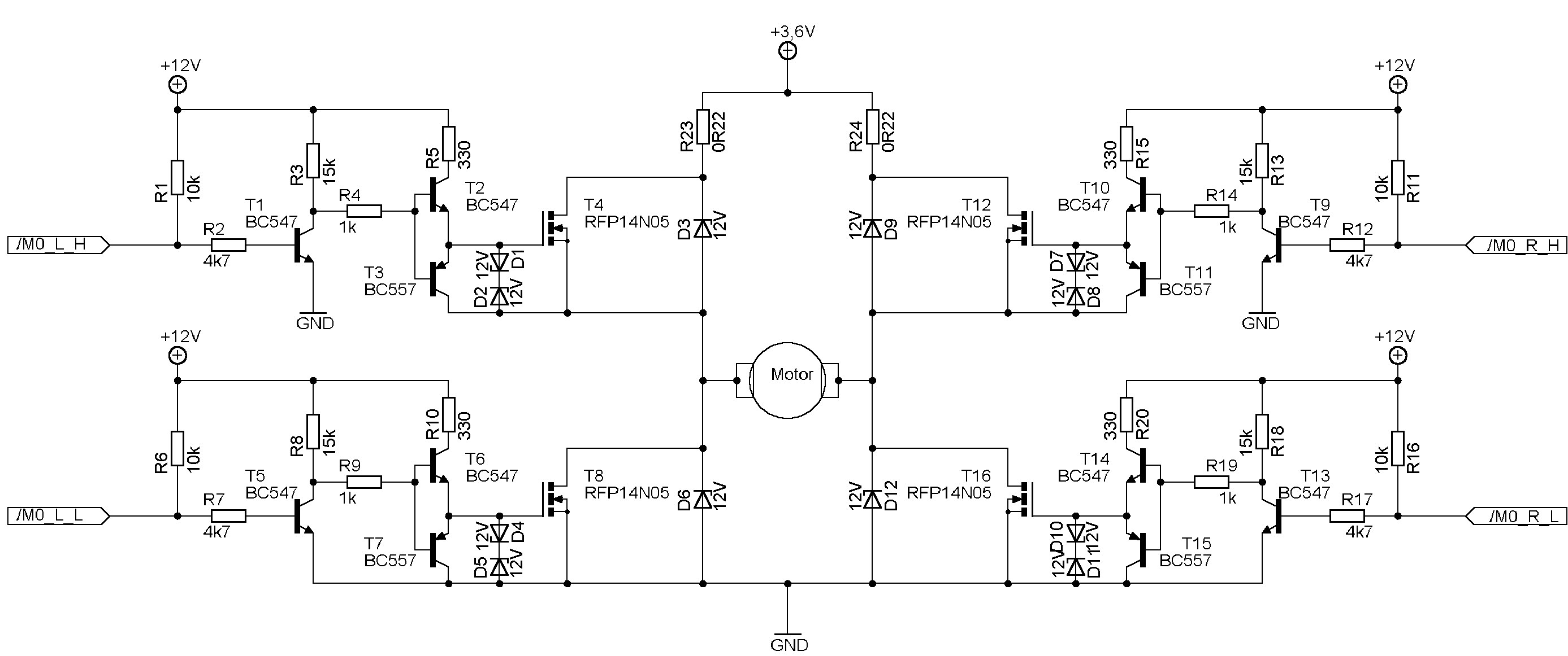 Den maximala spänningen till motorerna är satt till 3,6V i schemat, eftersom jag provade kretsen med en skruvdragarmotor, och såg att alla induktiva elakheter inte kom upp i nivåer som är skadliga för kretsen. Men troligen kan spänningen höjas, speciellt om du har motorer med låg induktans (fråga mig inte var gränsen går). Det viktiga är att höga sidans gatespänning på c:a 12V minus ett framspänningsfall på c:a 0,7V ska vara absolut minst 5V högre än source-spänningen på samma transistor när den leder. Hellst ska skillnaden vara större, men inte större än 12V.