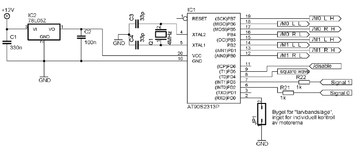 Jag kan också påpeka att i detta schema är kondensatorerna kring kristallen på 33pF, medan de bara var på 18pF i min prototyp. Det högre värdet på 33pF ger en mer pålitlig oscillator, samtidigt som strömförbrukningen höjs (omärkbart jämfört med vad motorerna som styrs drar). - AT90S2313 är en mikrokontroller, som måste programmeras innan projektet fungerar. Hexfilen kan laddas ned här. Hela källkoden kan laddas ned här