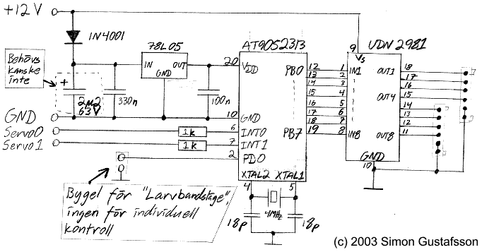 - GND är givetvis jordningen för kretsen. Hit kopplas den jord som hör ihop med 12V-källan. Även servonas jordanslutningar MÅSTE kopplas in här för att kretsen skall fungera.