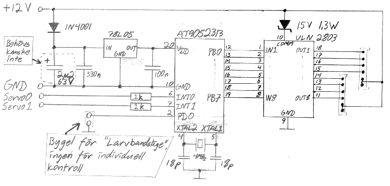 - ULN2803 är en darlingtondrivare, med åtta utgångar, och inbyggda seriemotstånd för direkt koppling till logiska kretsar. Jag har alldrig byggt något med denna krets, så jag vet inte om den skall kopplas som i schemat.